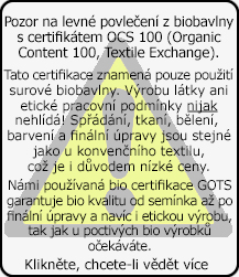 Bio povlečení vyrobené z nejčistších materiálů certifikovaných komplexní biotextilní certifikací Global Organic Textile Standard, která garantuje dodržování nejpřísnějších současných ekologických a etických standardů ve všech fázích výroby: od semínka, přes pěstování, sklízení, spřádání, tkaní/pletení, bělení a barvení až po závěrečné úpravy materiálu. Svou komplexností, rozsahem a náročností požadavků představuje úplně nový samostatný stupeň čistoty a etiky výroby textilu a diametrálně přesahuje jakoukoliv jinou v ČR dostupnou textilní certifikaci.
