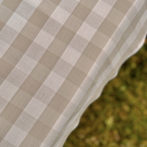 Klasické béžové káro v šíři 120 cm, se čtverci 2,5 x 2,5 cm. Ručně tkaná látka na tradičních dřevěných stavech v Indii s typickou nepravidelností a občasnými chybkami.